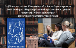 Bókaklúbbur Grafarvogskirkju les bókina Jötunsteinn eftir Andra Snæ Magnason. Hittumst fimmtudaginn 29. janúar kl. 20-21:30 og spjöllum um bókina. Tölum líka almennt um bækurnar í jólabókaflóðinu, hvað við höfum lesið nýlega sem við mælum með [...]