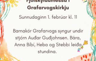 Fjölskyldumessa kl. 11:00 í Grafarvogskirkju. Sr. Bára Friðriksdóttir þjónar. Barnakór Grafarvogs syngur. Undirleikari er Stefán Birkisson. Sunnudagaskólinn sameinast messunni. Umsjón hafa sr. Aldís Rur Gísladóttir og Margrét Heba Atladóttir. Selmessa kl. 13:00 í [...]