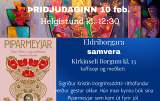Samvera eldri borgara í Kirkjuselinu Borgum. Helgistund kl. 12:30. Þriðjudaginn 10 febrúar fáum við góðan gest til okkar í eldriborgara samveruna. Sigríður Kristín Þorgrímsdóttir rithöfundur kynnir bók sína Piparmeyjar. Afskaplega skemmtileg og vel samin bók [...]