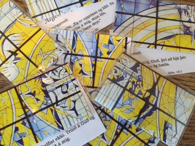 Í ár eru ritningarversin rituð á rúðubrot en mynd af glugganum hefur verið bútuð niður, versið, nafn og fermingardagur ritaður á bakhliðina og síðan búið um allt saman innan í hörðu plasti.