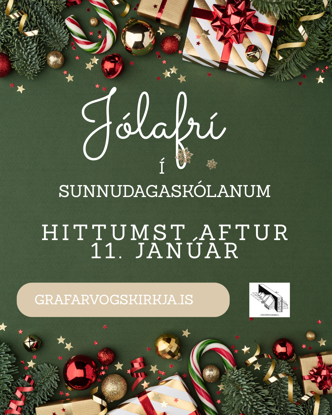 Sunnudagaskólinn er kominn í jólafrí. Fyrsta samvera eftir jól verður fjölskyldumessa 11. janúar. Við óskum ykkur gleðilegra jóla og hlökkum til að hittast aftur á nýju ári!
