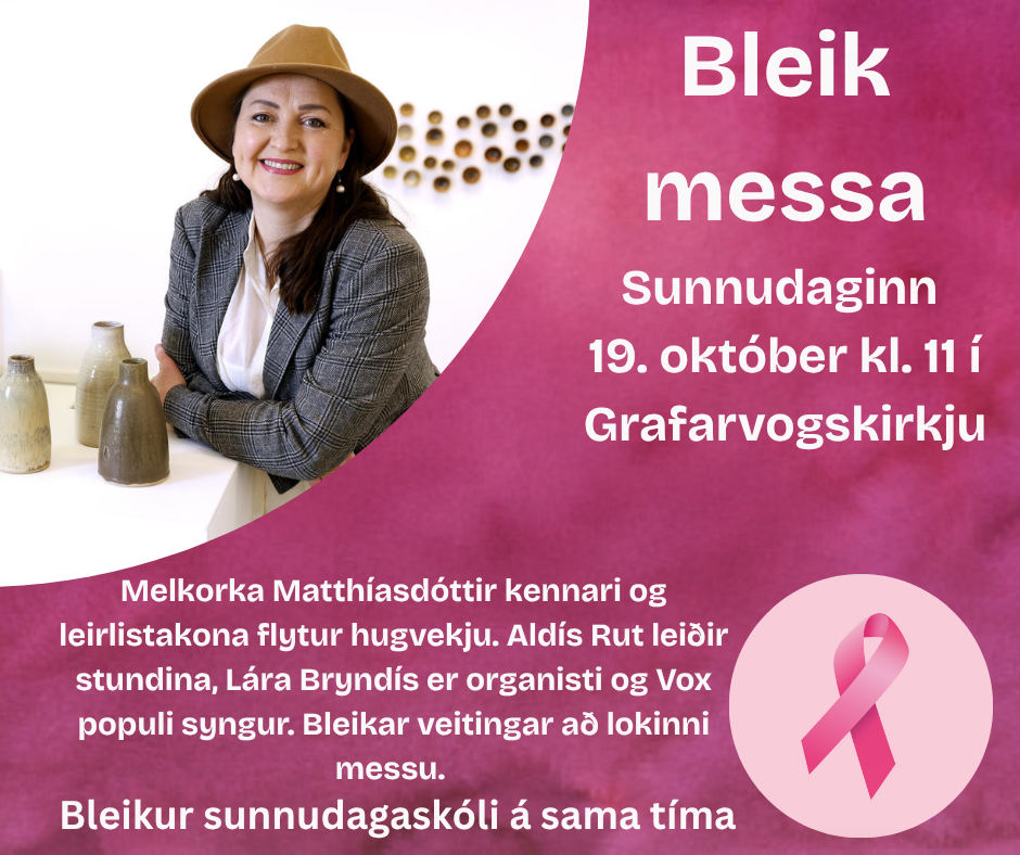 Bleik messa 19. október kl. 11 í Grafarvogskirkju Melkorka Matthíasdóttir leirlistakona og kennari flytur hugvekju. Aldís Rut leiðir stundina, Lára Bryndís er organisti og Vox populi syngur. Bleikar veitingar eftir messu og bleikur sunnudagaskóli á [...]
