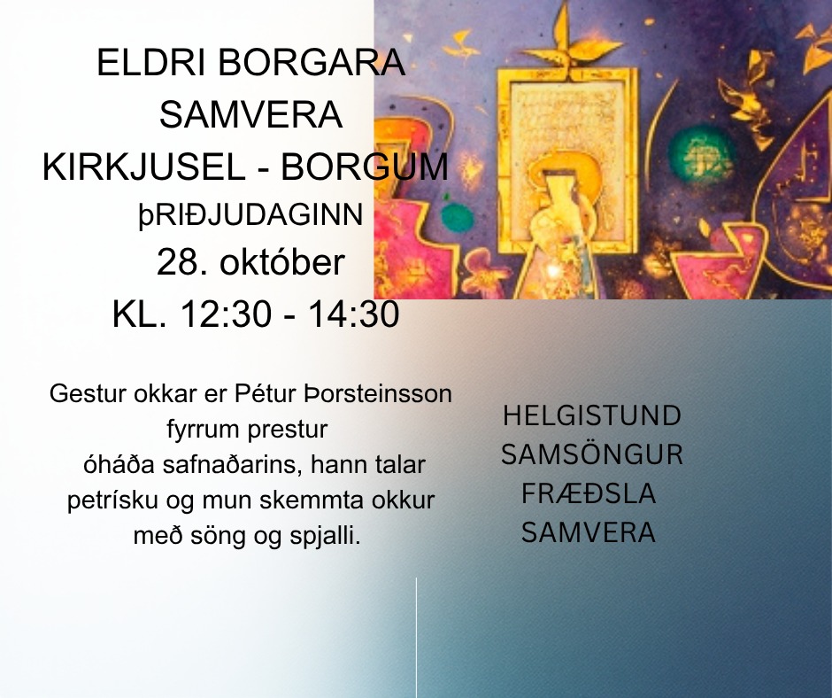 ATH! Samvera eldri borgara verður kl. 12:30-14:30 í Kirkjuselinu í Borgum! Kyrrðar- og fyrirbænastund hefst kl. 12:30. Að henni lokinni er samvera eldri borgara með söng og fræðslu. Gestur dagsins verður Pétur Þorsteinsson fyrrum prestur [...]