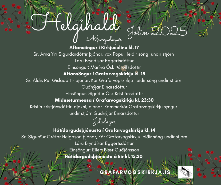 Fjölbreytt helgihald verður í Grafarvogssókn yfir jólahátíðina 2025... Aðfangadagur: Kirkjusel í Spöng - Aftansöngur kl. 17:00 Sr. Arna Ýrr Sigurðardóttir þjónar. Vox Populi leiðir söng undir stjórn Láru Bryndísar Eggertsdóttur organista. Einsöngur: Marína Ósk [...]