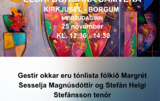 Samvera eldri borgara í Kirkjuselinu í Spöng 25. nóvember... Samveran hefst kl. 12:30 með helgistund. Gestir dagsins eru tónlistarfólkið Margrét Sesselja Magnúsdóttir og Stefán Helgi Stefánsson tenór. Samsöngur og spjall. Verið öll velkomin!